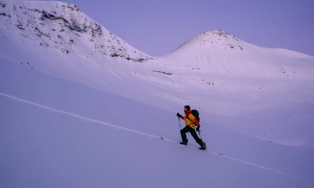 横穿:Antti尽量沿着能让他免受雪崩或落石影响的路线前进。尽可能的话,他尽量沿着山脊攀登。