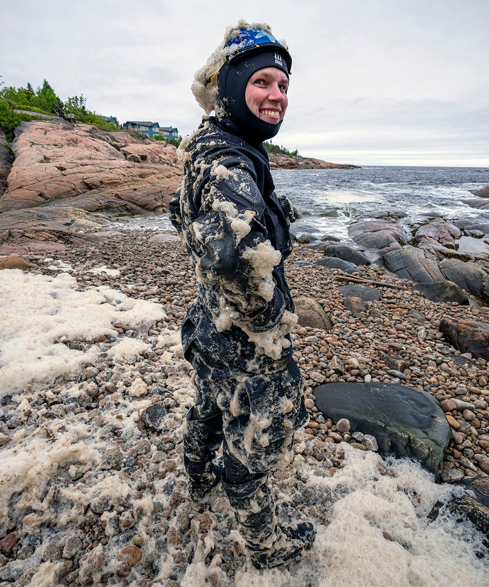 凯拉·马丁在Les Escoumins的海上泡沫中玩耍。