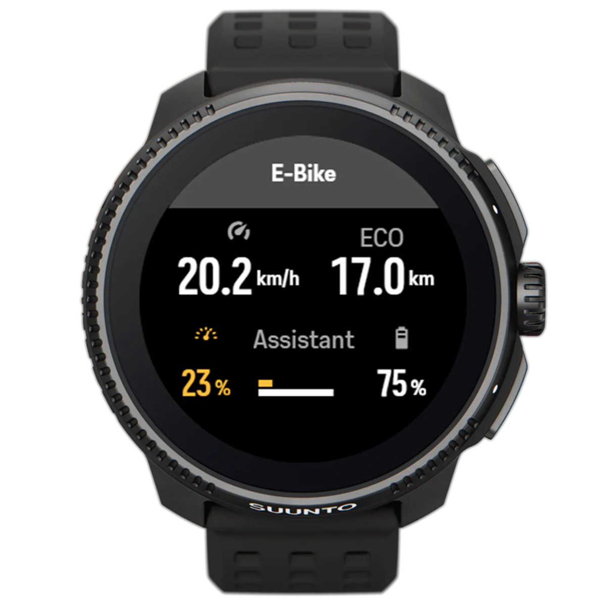 SHIMANO E-BIKE SYSTEMS SuuntoPlus 运动应用程序是一项与 SHIMANO 合作开发的功能,在你骑行过程中,可实时在 Suunto 手表上直接显示助力模式(节能、增强、越野)、助力级别、电动自行车电池状态、速度和心率等信息。