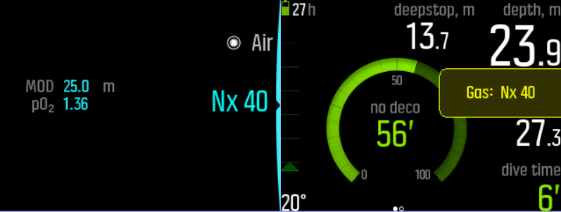 潜水电脑将切换气体,并显示您已切换到的气体。