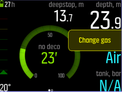 当您看到通知时, 您需要手动切换到潜水计划中的下一个气体 :