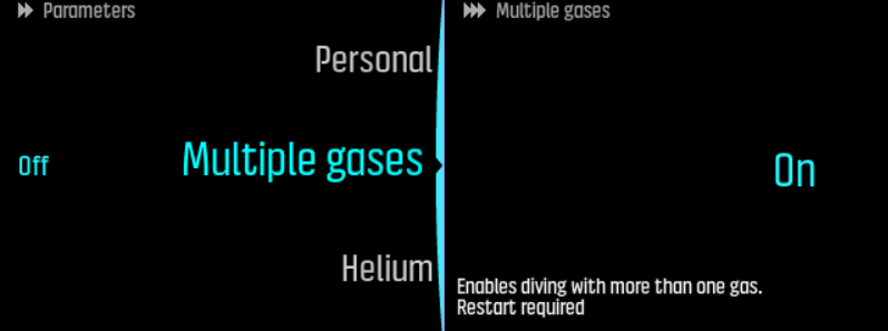 - 通过潜水电脑的设置激活多气体潜水(潜水设置 => 参数 => 多气体 => 切换为开启)。