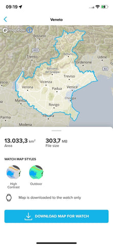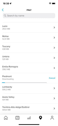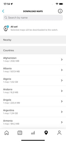 在"附近"部分或从总列表中找到您选择的地图区域所在的国家,或使用搜索栏按名称查找。然后选择您感兴趣的特定区域。这将打开该区域的详细页面:点击"下载地图到手表",下载将开始。您可以选择多个区域进行下载,这将创建一个下载队列,手表将依次处理。