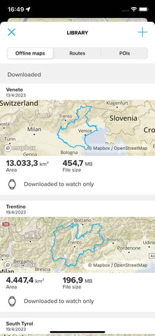 您可以将多个地图区域下载到手表上:您可以在您的Suunto应用程序库中找到您下载的地图:您现在可以将地图与Suunto手表一起使用,作为独立的导航功能,或在记录锻炼时使用。