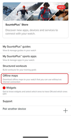现在您可以选择地图并将其下载到您的手表上。您可以从手表选项卡("离线地图")或Suunto应用程序中的地图选项卡开始。"下载"离线地图":