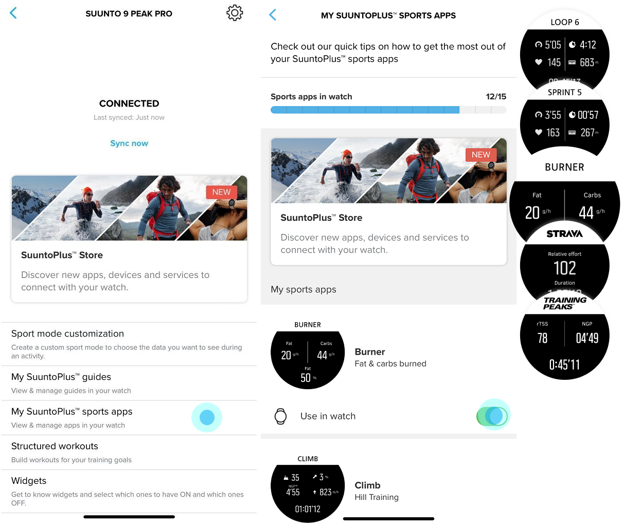 注意:使用 Suunto 9 Peak Pro 和 Suunto Vertical时,您可以在记录运动时 同时使用 2 个 SuuntoPlus™ 运动应用程序,而不仅仅是一个。此外,使用这两款型号时,您甚至可以在记录过程中选择 SuuntoPlus™ 运动应用程序,而不仅限于开始时。