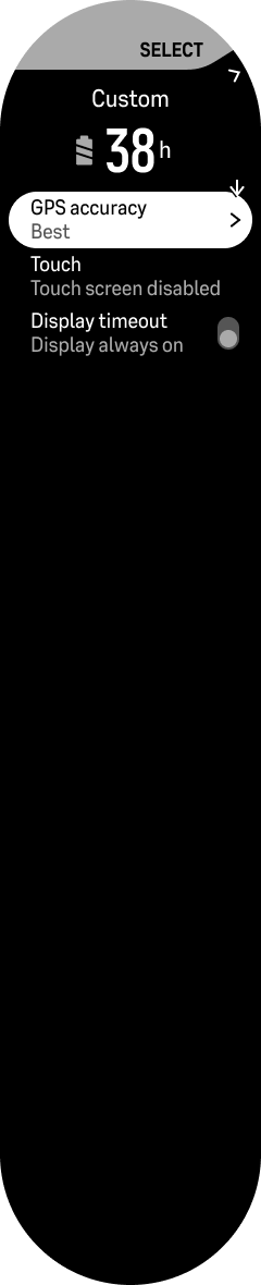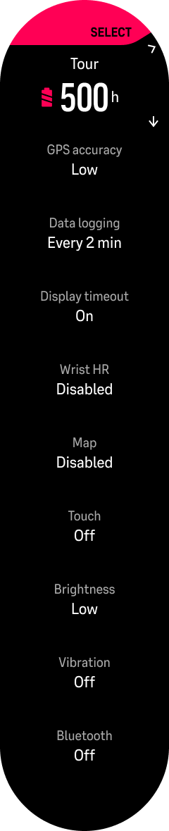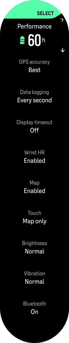 开始锻炼时,默认激活性能模式。要切换模式,请向下滑动并进入选项中的“电池模式”:选择一种模式后,您将看到电池模式设置,如下所示: