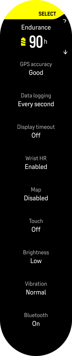 在Suunto Vertical上有4种预定义的电池模式: 性能模式、 耐力模式、 超长续航模式 和 旅行模式。您还可以创建一个 自定义 电池模式(注意:如果您想在记录期间启用触摸显示功能,这将特别有用,因为所有默认电池模式默认情况下都关闭了触摸显示。自定义电池模式始终与运动模式相关,这意味着您可以根据需要为每种运动定义不同的自定义模式)。手表会记住电池模式的选择:下次启动相同的运动模式时,手表会建议您上次为该运动模式选择的电池模式。