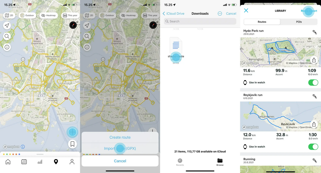 - 或者,在地图视图中的 加号 (+) 图标下,你可以找到库按钮。点击它,然后在右上角,你可以直接选择 路线导入 并按照相同的流程操作。