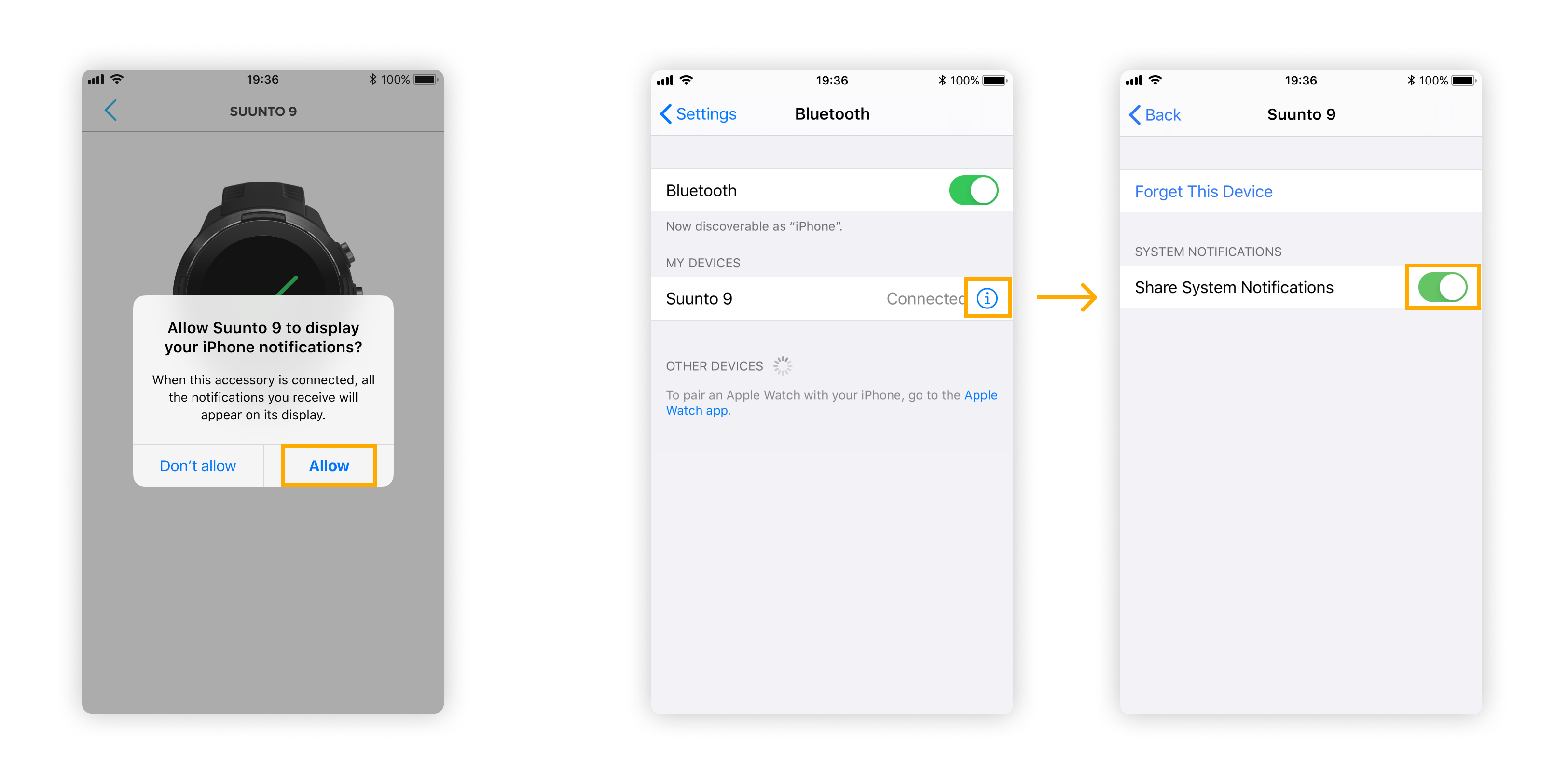 - 如果尚未配对,请将您的手表与 Suunto 应用配对,并等待同步完成。配对成功后,接受 Suunto 应用提示的通知权限对话框。