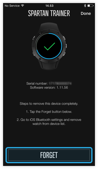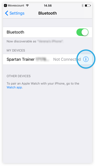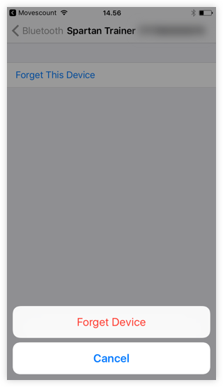 打开Movescount应用程序并点击屏幕右上角的手表图标。在手表状态视图中,点击左上角的“详情”,然后选择“忘记”按钮。 - 在您的移动设备设置中,进入 蓝牙 并通过点击信息图标然后选择 忘记此设备,将您的手表从已连接设备列表中移除。