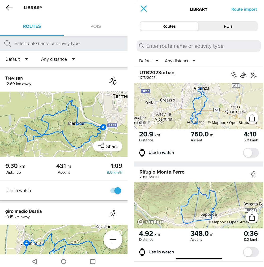 要 从您的手表中移除路线,请在路线库中找到它并关闭“在手表上使用”选项。该路线仍会存储在您的路线库中,您可以通过再次切换选项重新激活它。要 完全删除路线,请打开它并选择删除选项(Android 上的垃圾桶图标,iOS 上的三个点然后“删除”)。