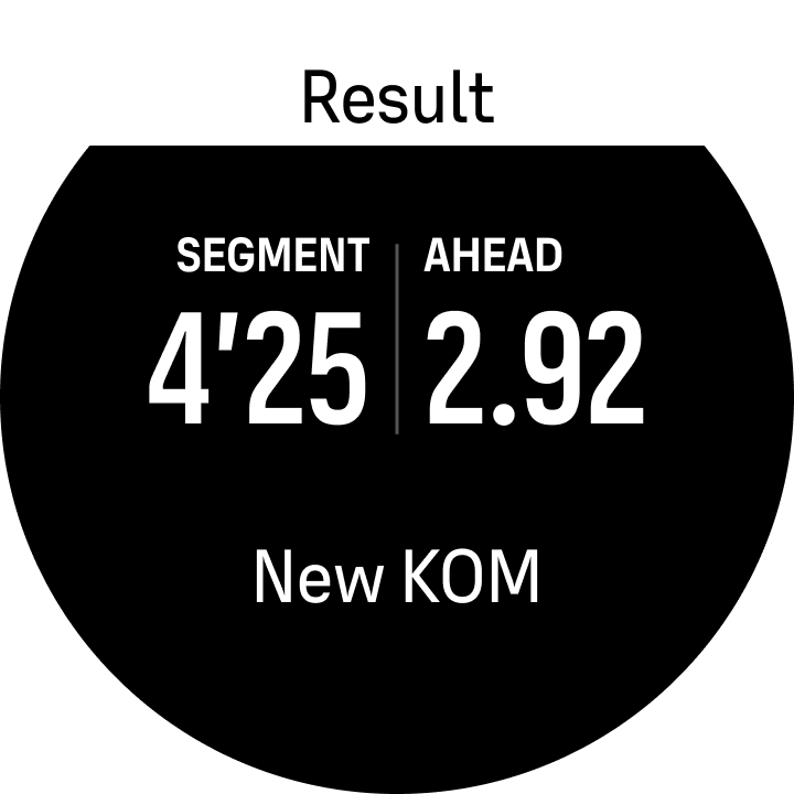 在路段结束时,将显示结果:持续时间,以及您是否落后或领先于之前的 PR,以及是否建立了新的 KOM/QOM(注意:此显示将持续 20 秒,之后显示将回到显示最近的路段)。