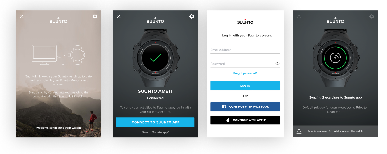 - SuuntoLink将识别您的设备,并会要求您提供Suunto应用程序的登录信息(如果有未同步的锻炼记录)。