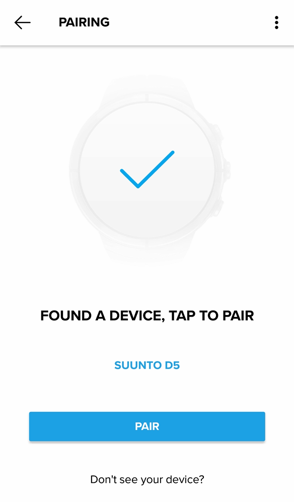 - 当您的 Suunto D5 出现在设备列表中时,点击 配对。如果列出了多个设备,请根据设备背面显示的序列号选择您的潜水电脑。