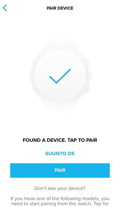 - 当您的 Suunto D5 出现在设备列表中时,点击 配对。如果列出了多个设备,请根据设备背面显示的序列号选择您的潜水电脑。