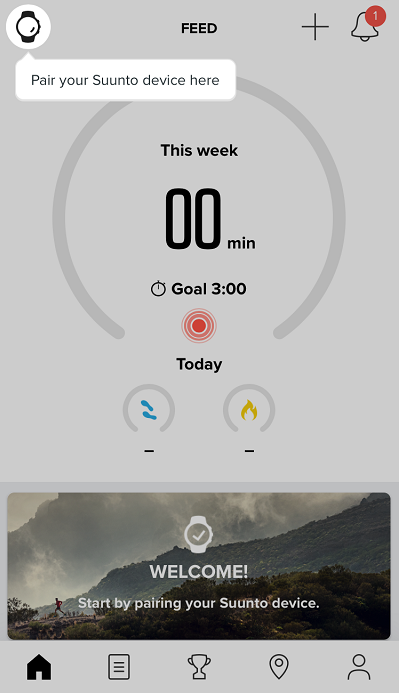 - 启动 Suunto 应用程序并点击 “手表”图标 进入手表视图。打开手机的蓝牙。