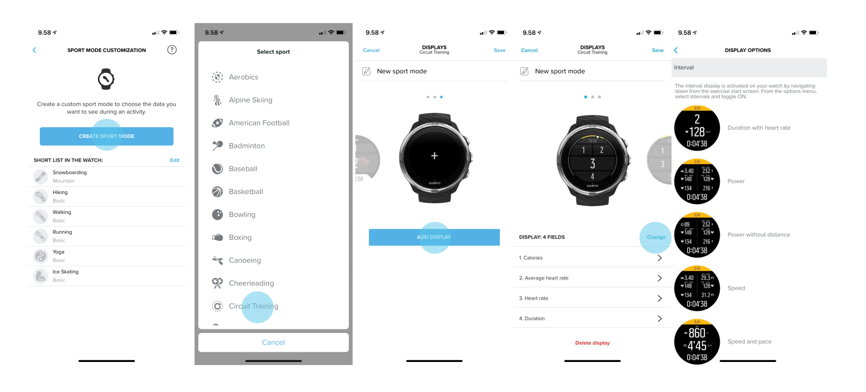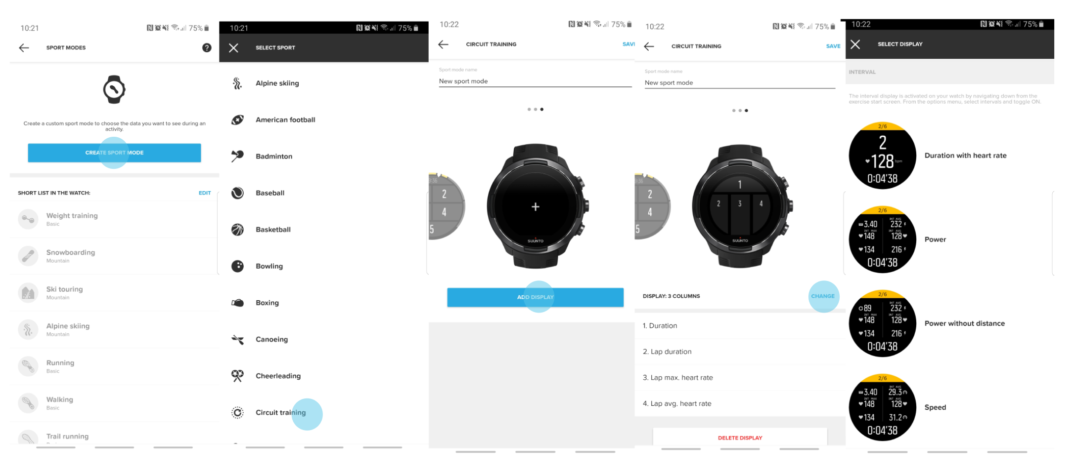 然而,间歇训练在 自定义 运动模式中默认不可用。如果您想在使用自定义运动模式时进行间歇训练,请确保您的运动模式显示之一是“间歇”显示。在运动模式自定义过程中,您需要通过 Suunto应用程序添加上述间歇显示。将更改同步到您的手表,并按照上述步骤操作。