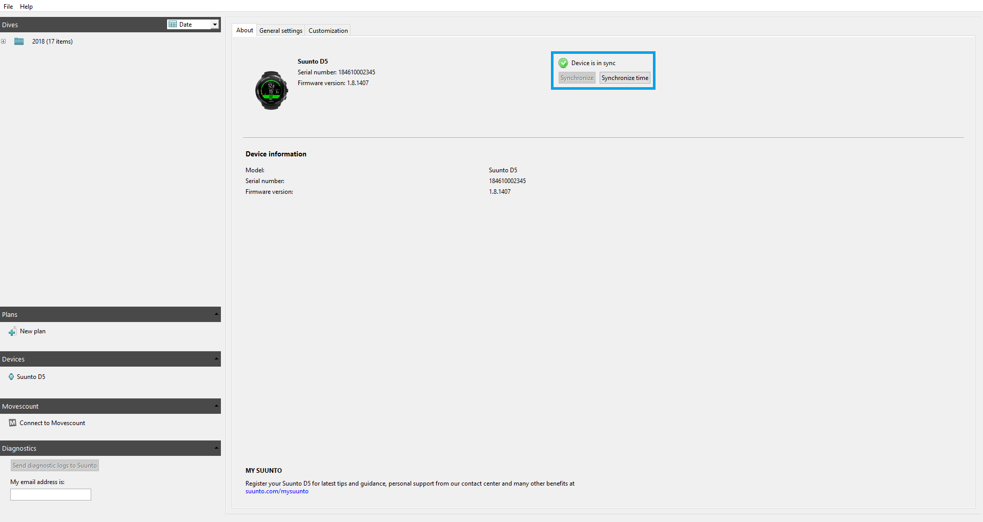 注意:您的潜水电脑将自动重启。请确保在同步过程中不要断开与电脑的连接。 - 一旦您的 设备同步完成,您就可以将Suunto D5从电脑上断开。