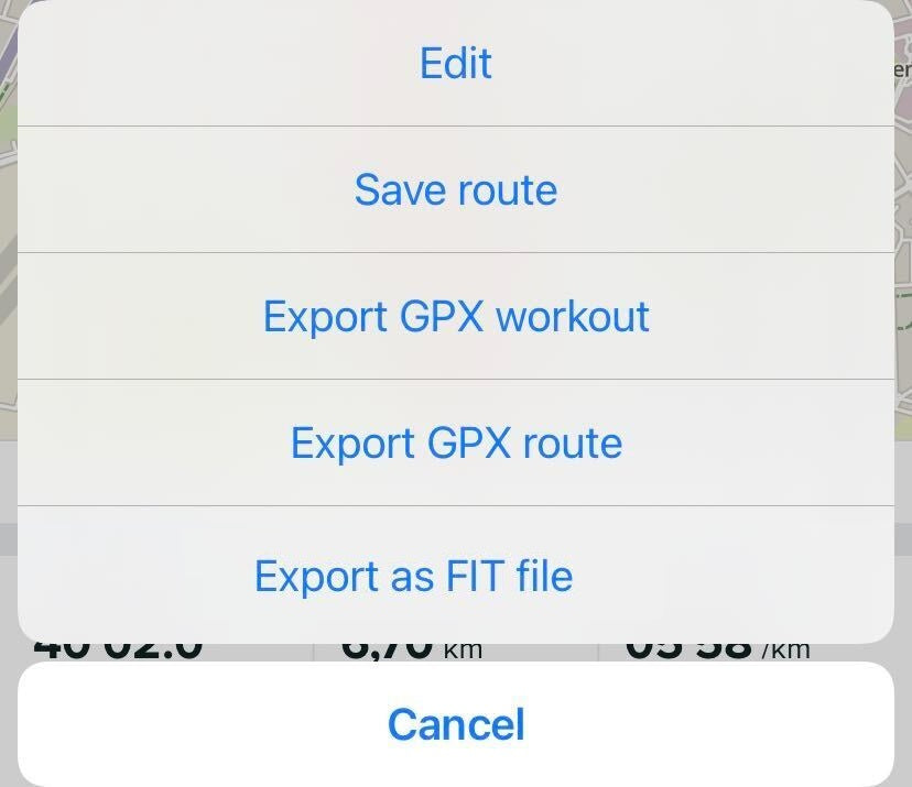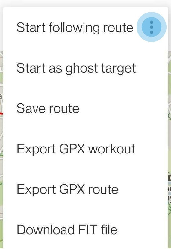 要导出信息,请转到 Suunto 应用程序中的任意一个锻炼,然后点击右上角的三个点。选择您想要导出的格式,并将文件保存到您的设备上,或直接在兼容的应用程序中打开。