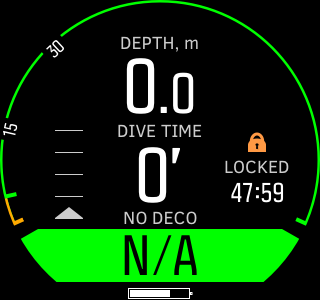 因此,当在仪表模式潜水后切换到空气/高氧潜水模式时,Suunto D5 无法提供减压信息,而这些信息对于进一步的计算和安全潜水至关重要。作为一项安全措施,减压计算将在 48 小时后重新可用。